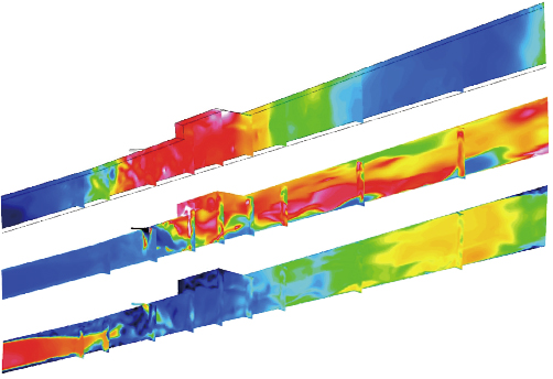 Keywords: Compressible fluid, Supersonic combustion, Shockwave, Boundary layer, Detailed reaction, Eddy break-up model「NuFD/FrontFlowRed」は非圧縮性流れから超音速流れまでの幅広い速度域での計算が可能です。(※1)は亜音速から超音速に加速されて衝撃波が生じている様子を表しており、実験に非常に近い圧力分布が得られています。また(※2)は超音速で飛翔する航空機用エンジン内部の解析例を示しています。本エンジン内部では衝撃波、境界層、燃料噴射、乱流混合や燃焼が相互に複雑に干渉し合うため、これらの複雑な現象を高精度で解析する必要があります。これまでに、非定常現象を再現できるLESを適用し、燃焼モデルとして渦崩壊モデルや詳細反応モデルを用いて、非定常な超音速燃焼流れ場を再現しています。